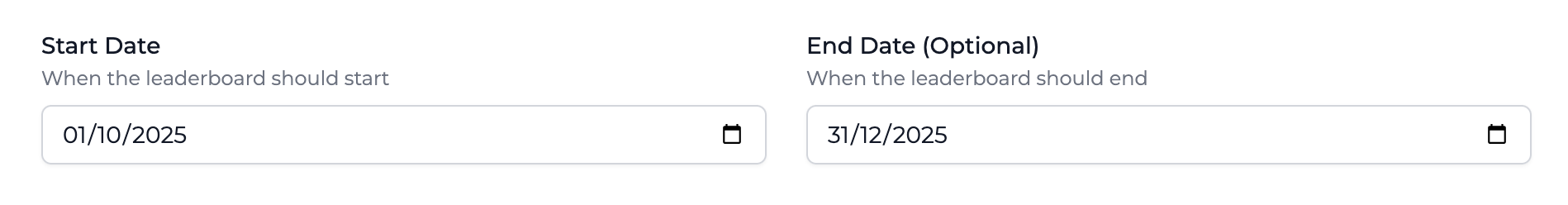 Use start and end dates to control the window within which leaderboards are actively ranking users.